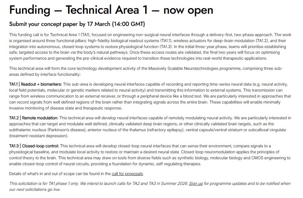 I spoke briefly with Jacques Carolan, Programme Director for Scalable Neural Interfaces at ARIA, to learn more about this new initiative and their broader strategy in catalyzing neurotech innovation over the last two years. What follows is a condensed interview, with some additional q&a for paying members.
